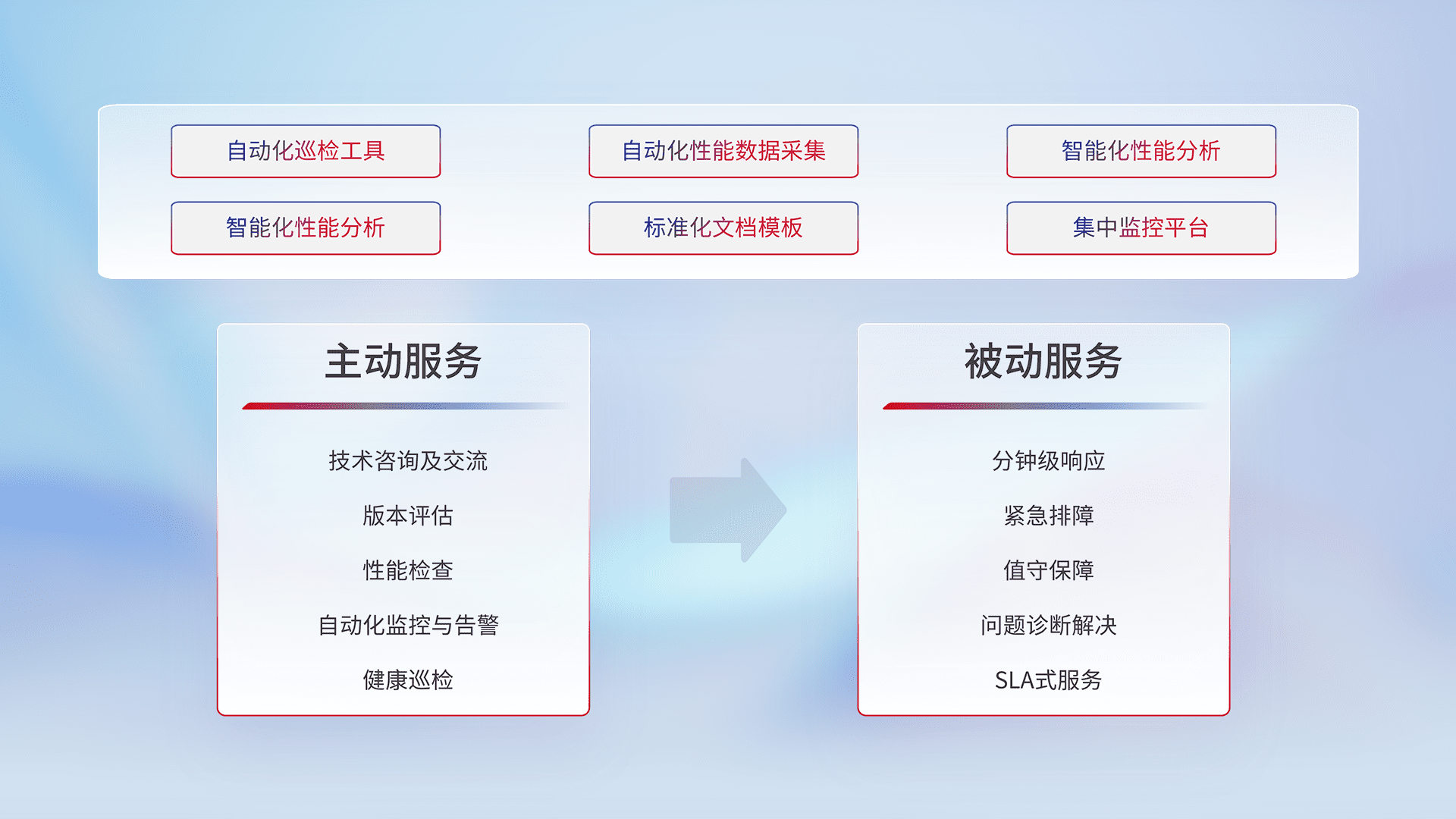 智能化工具和标准化文档,,保障服务质量,,提供主动服务(包含技术咨询、、、版本评估、、性能检查、、自动化监控与告警、、、健康巡检)和被动服务包含(分钟级响应、、、、紧急排障、、、、值守保障、、、问题诊断解决、、、SLA服务)。。